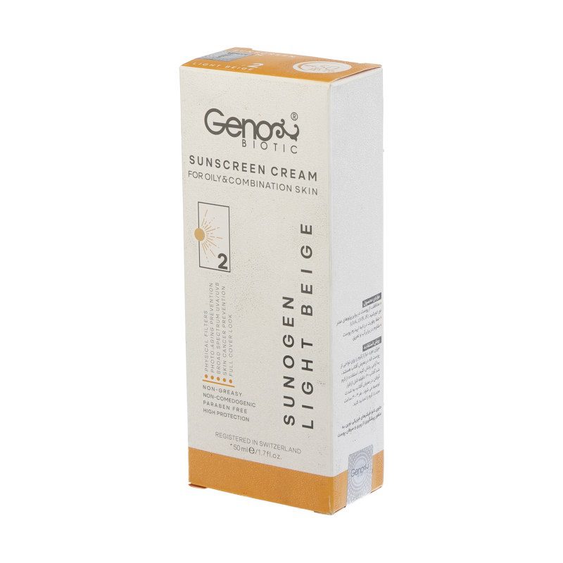 ضد آفتاب بژ روشن ژنوبایوتیک spf50 فاقد چربی حاوی فیلترهای فیزیکی تیتانیوم دی اکساید و زینک اکساید و فیلتر شیمیایی اکتینوکسات است. از عصاره های گیاهی مثل عصاره گل آفتابگردان و عصاره گل مغربی هم استفاده شده است که رطوبت رسان، تعدیل کننده چربی و UV فیلتر می باشند.این کرم از پوست در برابر رادیکال های ازاد که موجب پیری پوست می شوند محافظت می نماید. فیلترهای فیزیکی یعنی زینک اکساید و تیتانیوم دی اکساید جزء سالم ترین و ایمن ترین فیلترهای اشعه UV هستند. این دو ترکیب با قرار گرفتن در سطح پوست اشعه UV را بازتاب میدهند. کرم های ضد آفتاب sunogen2 ژنو paraben free بوده بنابراین از پوست شما در برابر آکنه و جوش محافظت کرده و و حتی با خاصیت مات کنندگی و کنترل عملکرد غدد چربی پوست و وجود سالسیلیک اسید مناسب برای پوستهای مستعد آکنه می باشد. قابلیت بدون چربی بودن این ضد آفتاب موجب می شود تا در هنگام استفاده به هیچ عنوان احساس چرب بودن پوست و سنگینی بر روی صورت را نداشته باشید و تنفس پوست شما به راحتی انجام می شود و شادابی و طراوت پوست صورت شما هم حفظ می شود . استفاده از امولسیون کنندهی پیشرفته در این فرآورده سبب پایداری آن در برابر تجزیه نوری، تعریق و شستشو با آب معمولی یا به هنگام انجام فعالیتهای ورزشی شده است.