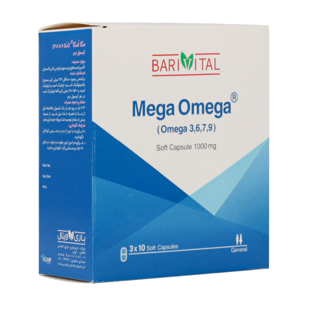 سافت ژل مگا امگا ۱۰۰۰ میلی گرم ۹ ۷ ۶ ۳ باریویتال در ترکیبات خود، دارای بذر کتان بوده که به عنوان منبع امگا ۳ و امگا ۶ شناخته شده است. بذر کتان به دلیل دارا بودن اثرات آنتی اکسیدان، ضد درد، ضد میکروب، ضد التهاب، کاهش دهنده چربی است. بعلاوه توانایی بالقوه در کاهش خطر بیماریهای قلبی عروقی به صورت گستردهای مورد بررسی قرار گرفته است. این اثرات اساسا به دلیل وجود مقادیر زیاد اسیدهای چرب غیر اشباع چند زنجیرهای فیبرهای محلول و لیگنانها است. اثرات ضد التهابی روغن بذر کتان به دلیل مهار پروستا گلاندین و سایر مواد است و با اثر آسپرین قابل مقایسه است. از سوی دیگر گل مغربی ترکیبات سافت ژل مگا امگا دارای ۱۵ تا ۲۰ درصد روغن بوده که منبع امگا ۶ است. روغن گل مغربی برای بهبود نوروپاتی دیابتی و درماتیت آتوپیکو همچنین کاهش فاکتورهای خطر قلبی عروقی مانند کاهش فشار خون شریانی و کلسترول تام استفاده شده است. سبوس برنج با دارا بودن امگا ۳ و امگا ۶ در جوانسازی پوست موثر بوده و سبب بهبود آبرسانی و خاصیت ارتجاعی پوست میشود. روغن سبوس برنج در بهبود فاکتورهای خطر بیماری قلبی عروقی موثر بوده و پس از ۴ هفته مصرف سبب کاهش قابل توجه وزن، شاخص توده بدن، اندازه دور مچ و دور کمر میشود.