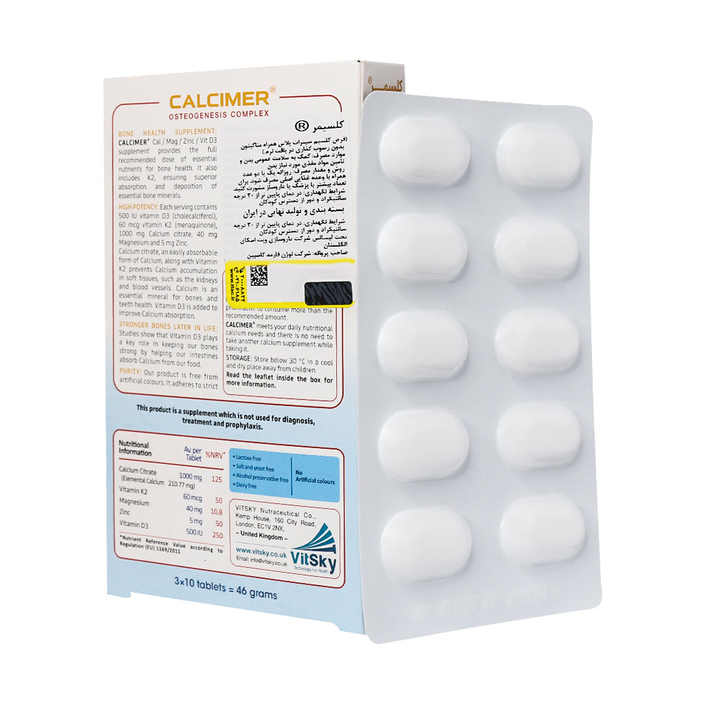 هر قرص کلسیمر ویت اسکای حاوی ۱۰۰۰ میلی گرم کلسیم سیترات، ۵۰۰ واحد ویتامین دی، ۴۰ میلی گرم منیزیم، ۵ میلی گرم زینک و ۶۰ میکروگرم ویتامین K۲ یا مناکینون بوده که برای حمایت از بافت استخوانی شما ساخته شده است. مطالعات اخیر نشان داده مصرف ملح سیترات کلسیم به همراه ویتامین کا۲ از رسوب و تجمع کلسیم در بافتهای نرم مانند کلیهها و عروق خونی جلوگیری میکند و مانع تشکیل سنگهای کلیوی میشود. همچنین این ترکیب به راحتی قابل جذب است و نقش مهمی در سلامت استخوانها و دندانها دارد. ویتامین D۳ نیز برای کمک به جذب بهتر کلسیم به این مکمل اضافه شده است. مکمل کلسیمر به حفظ سلامت استخوانها و افزایش تراکم آنها، سلامت دندانها، جلوگیری از پوکی استخوان، رشد بدن، استحکام بخشیدن به استخوانها، سلامت مو و ناخن و همچنین تقویت سیستم ایمنی بدن کمک میکند. بنابراین، مصرف روزانه آن برای مردان و زنان در سنین مختلف شدیدا توصیه شده است. مکمل کلسیمر نیاز روزانه شما به کلسیم را برطرف کرده و حین مصرف آن نیاز به استفاده از قرص کلسیم دیگری نیست.